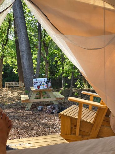 Experience the beauty of nature with our cozy riverside glamp site. Our 10x12 canvas wall tents offer a unique camping experience, perfect for those looking to relax and unwind.